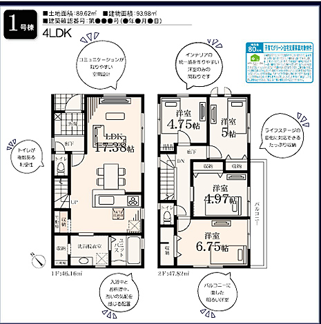 | 間取り | 4LDK(バルコニーあり) 間取り内訳:リビングダイニングキッチン 17.3帖(1階)・洋室 6.7帖(2階)・洋室 4.9帖(2階)・洋室 4.7帖(2階)・洋室 5帖(2階) |