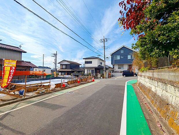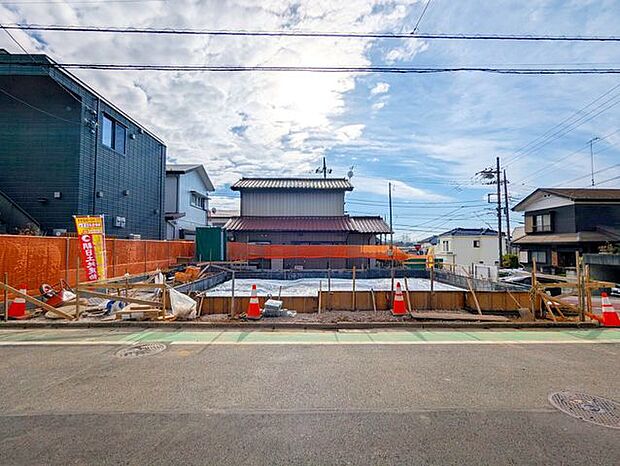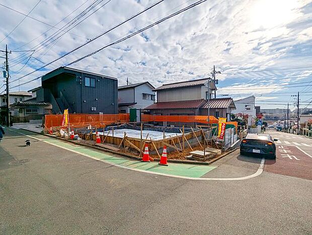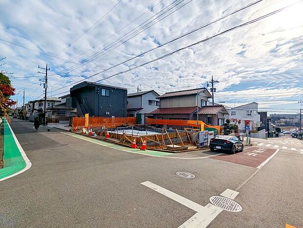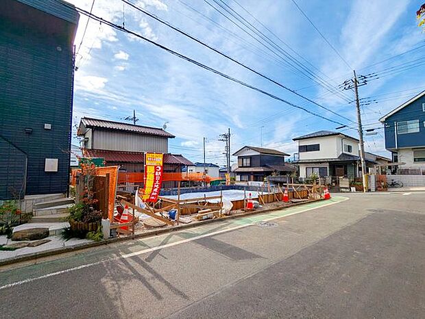 【バス停徒歩1分!角地で全室南向きの明るい新築4LDK!】カースペース3台駐車可玄関上部は吹抜けで明るく開放感あり安心の耐震構造+長期優良住宅