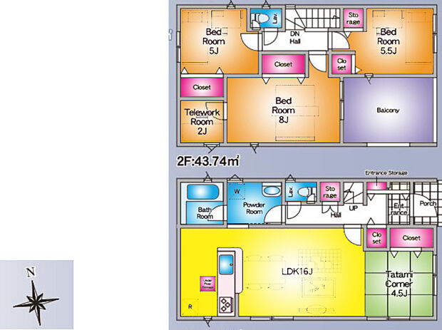 | 間取り | 3LDK 間取り内訳:リビングダイニングキッチン 16帖(1階)・和室 4.5畳(1階)・洋室 8帖(2階)・洋室 5.5帖(2階)・洋室 5帖(2階)・その他 2帖(2階) |