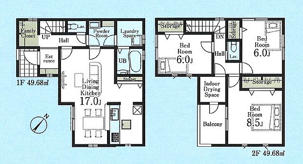 | 間取り | 3LDK 間取り内訳:洋室 8.5帖(2階)・洋室 6帖(2階)・洋室 6帖(2階)・リビングダイニングキッチン 17帖(1階) |