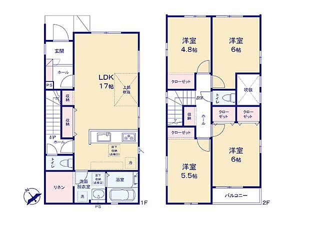 | 間取り | 4LDK 間取り内訳:洋室 9帖(2階)・洋室 6帖(2階)・洋室 5.5帖(2階)・洋室 4.8帖(2階)・リビングダイニングキッチン 17帖(1階) |