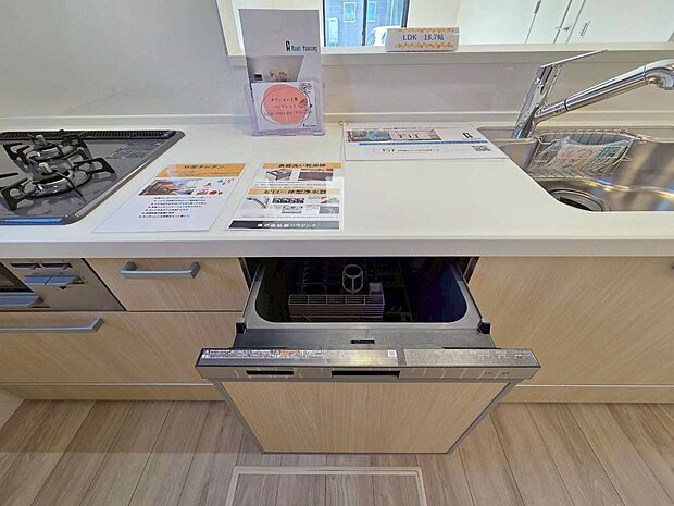 駐車スペース2台可(車種による) 完成済みにつき内覧・即時引渡し可能 浴室乾燥機付きバスルーム 食洗機付きシステムキッチン ハンドシャワー付洗面台 都市ガス