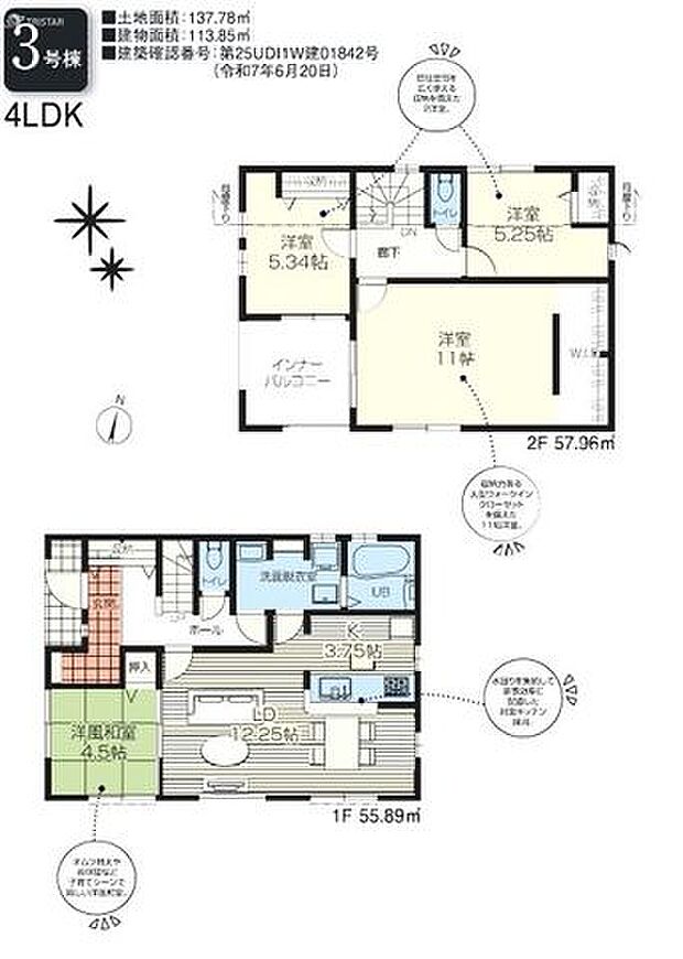 4LDK!!2階には大型WICを備えた11帖の洋室あり!!家族との会話が弾む対面キッチン♪全居室収納あり!雨風の影響を受けにくいインナーバルコニー!