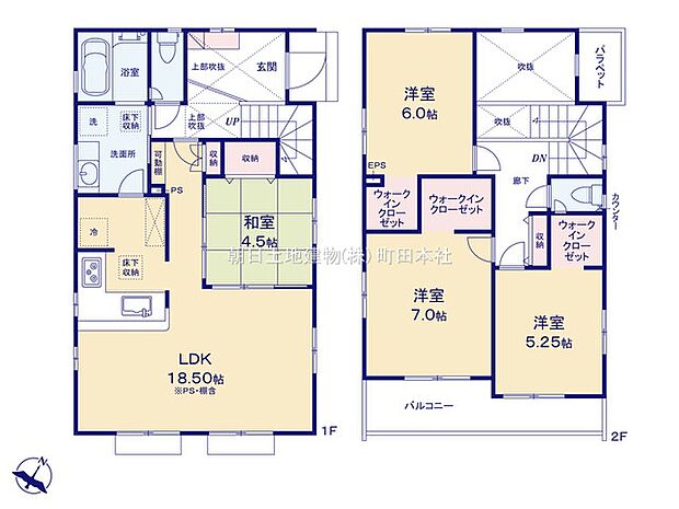 | 間取り | 4LDK 間取り内訳:リビングダイニングキッチン 18帖(1階)・和室 4.5畳(1階)・洋室 7帖(2階)・洋室 5.2帖(2階)x2 |