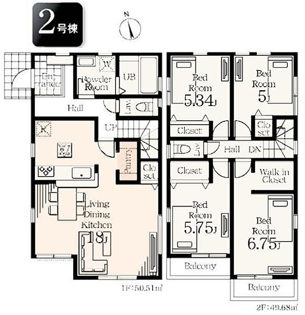 | 間取り | 4LDK 間取り内訳:リビングダイニングキッチン 18帖(1階)・洋室 6.7帖(2階)・洋室 5.7帖(2階)・洋室 5.3帖(2階)・洋室 5帖(2階) |