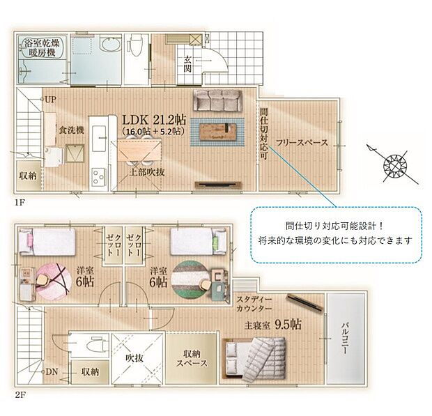 | 間取り | 3LDK 間取り内訳:リビングダイニングキッチン 21.2帖・洋室 9.5帖・洋室 6帖・洋室 6帖 |