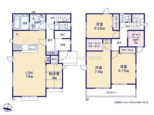 | 間取り | 4LDK(2階サービスルームあり) 間取り内訳:リビングダイニングキッチン 16帖・和室 3畳・洋室 7.5帖・洋室 6.2帖・洋室 5.7帖 |