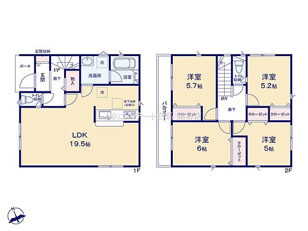 | 間取り | 4LDK 間取り内訳:リビングダイニングキッチン 19.5帖・洋室 6帖・洋室 5.7帖・洋室 5.2帖・洋室 5帖 |
