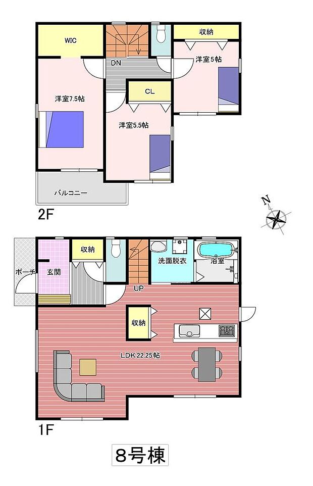| 間取り | 3LDK 間取り内訳:リビングダイニングキッチン 22.2帖(1階)・洋室 5帖(2階)・洋室 5.5帖(2階)・洋室 7.5帖(2階) |