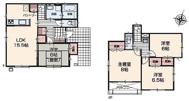 | 間取り | 4LDK 間取り内訳:リビングダイニングキッチン 15.5帖(1階)・洋室 6帖(1階)・洋室 8帖(2階)・洋室 6.5帖(2階)・洋室 6帖(2階) |