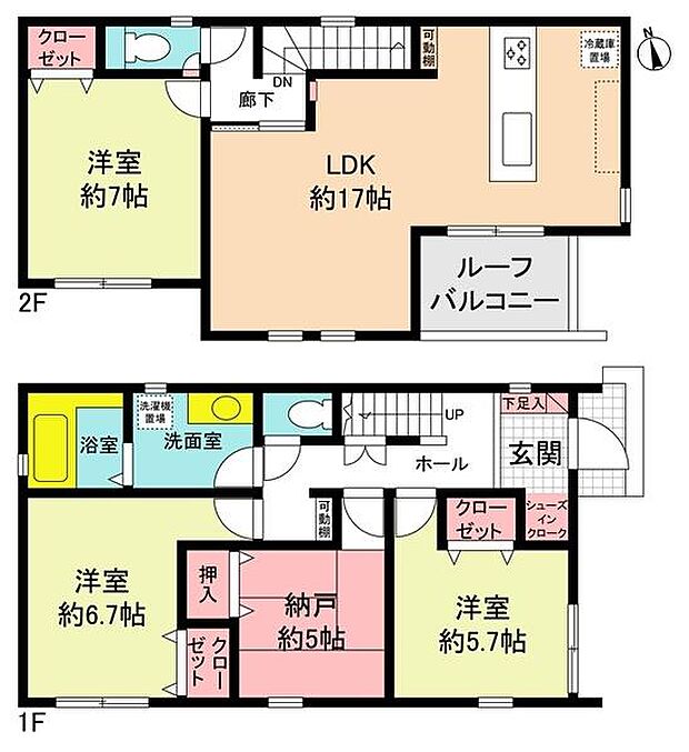 | 間取り | 3SLDK 間取り内訳:洋室 6.7帖(1階)・洋室 5.7帖(1階)・収納 5帖(1階)・リビングダイニングキッチン 17帖(2階)・洋室 7帖(2階) |