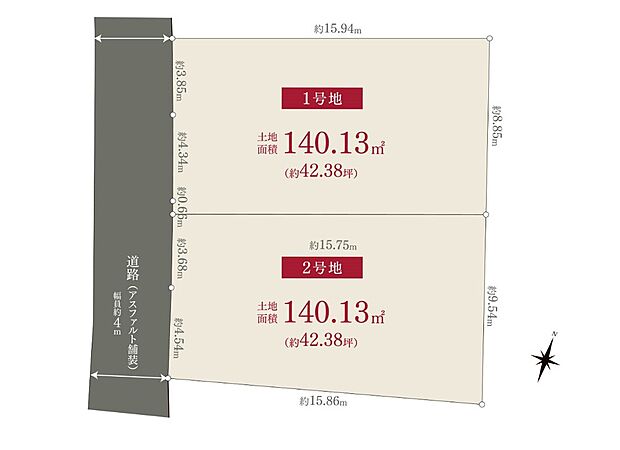 | 土地面積 | 1号地:140.13m2(約42.38坪)・2号地:140.13m2(約42.38坪) | ||