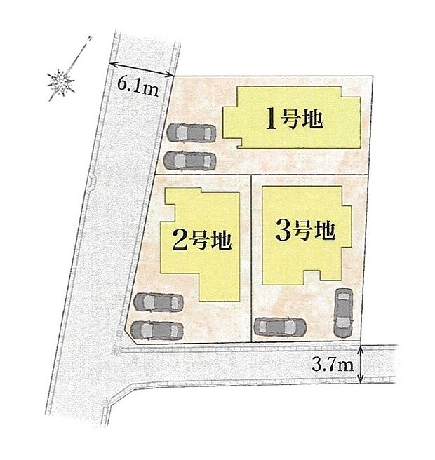 3号地:東3.7m /2号地:南6.1m 東3.7m /1号地:南6.1m