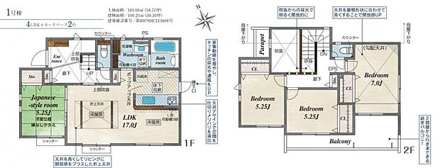 | 間取り | 4LDK 間取り内訳:リビングダイニングキッチン 17帖(1階)・和室 5.2畳(1階)・洋室 7帖(2階)・洋室 5.2帖(2階)x2 |