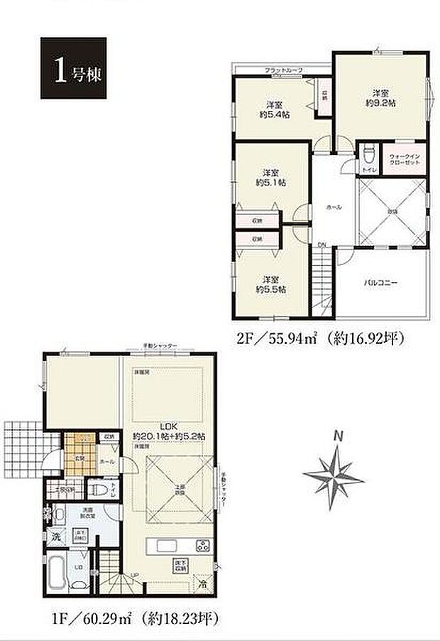 | 間取り | 4LDK 間取り内訳:洋室 5.4帖(2階)・洋室 5.1帖(2階)・リビングダイニングキッチン 25.3帖(1階)・洋室 9.2帖(2階)・洋室 5.5帖(2階) |