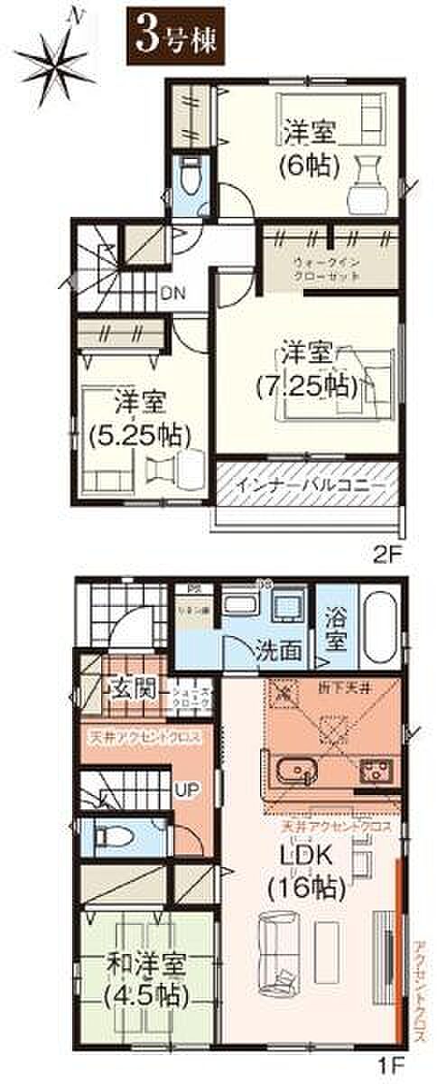 | 間取り | 4LDK 間取り内訳:リビングダイニングキッチン 16帖(1階)・和室 4.5畳(1階)・洋室 5.2帖(2階)・洋室 6帖(2階)・洋室 7.2帖(2階) |