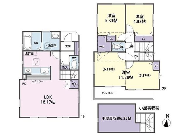 | 間取り | 3LDK 間取り内訳:リビングダイニングキッチン 18.1帖(1階)・洋室 11.2帖(2階)・洋室 5.3帖(2階)・洋室 4.8帖(2階) |
