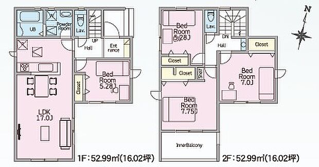 | 間取り | 4LDK 間取り内訳:リビングダイニングキッチン 17帖(1階)・洋室 5.2帖(1階)・洋室 7.7帖(2階)・洋室 7帖(2階)・洋室 5.2帖(2階) |