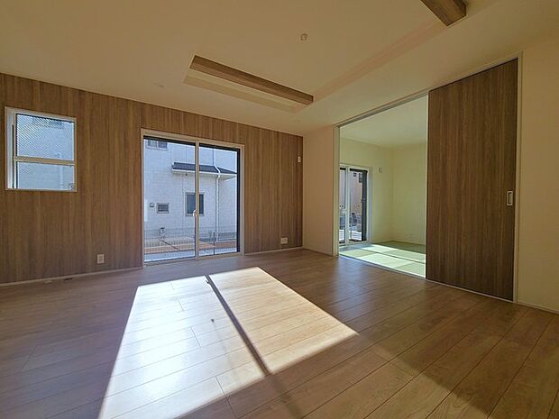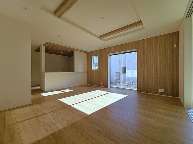 ・折り上げ天井とアクセントクロスのお洒落なリビング ・地震に備えた耐震制震の家 ・全居室南向きの明るい家