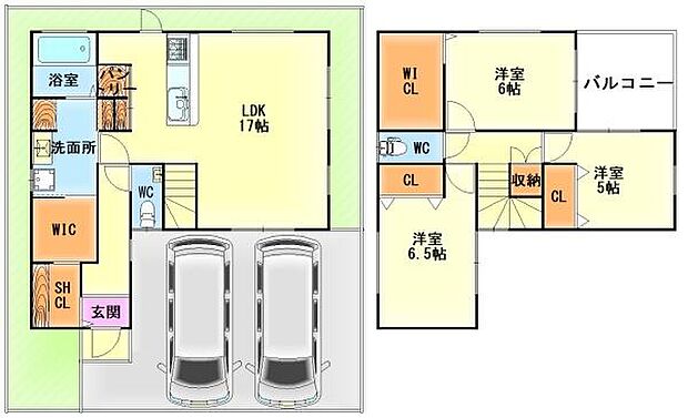 | 間取り | 3LDK 間取り内訳:リビングダイニングキッチン 17帖(1階)・洋室 6.5帖(2階)・洋室 6帖(2階)・洋室 5帖(2階) |