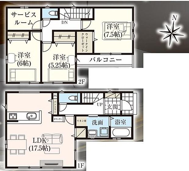 | 間取り | 3LDK 間取り内訳:リビングダイニングキッチン 17.5帖(1階)・洋室 7.5帖(2階)・洋室 6帖(2階)・洋室 5.2帖(2階) |