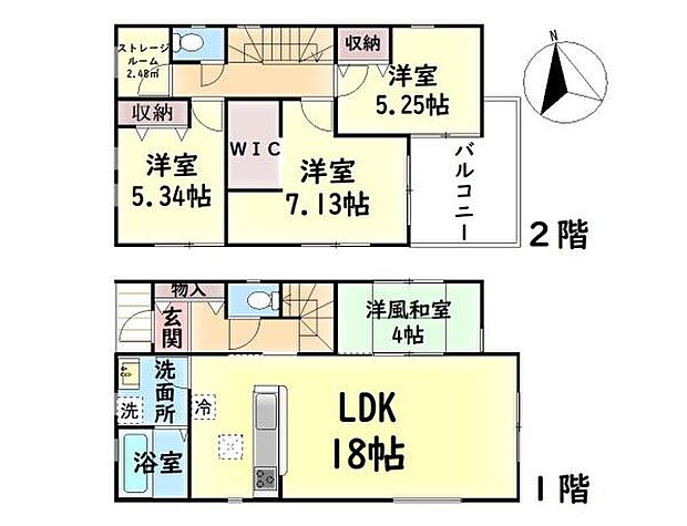 | 間取り | 4SLDK 間取り内訳:リビングダイニングキッチン 18帖(1階)・和室 4畳(1階)・洋室 7.1帖(2階)・洋室 5.3帖(2階)・洋室 5.2帖(2階) |