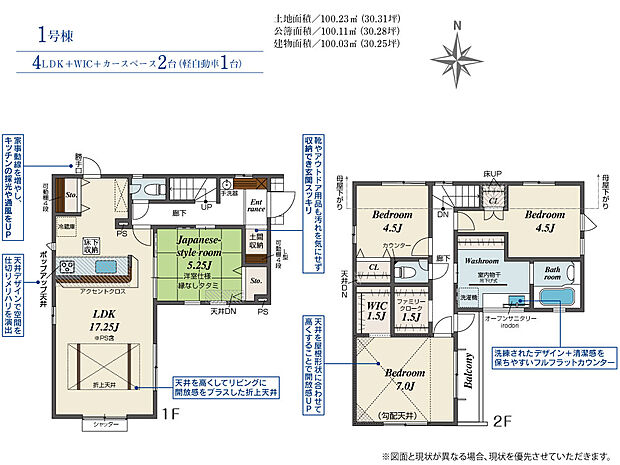 - 「建築条件付き土地」の「建物プラン例」は、土地購入者の設計プランの一例であり、プランの採用可否は任意です。