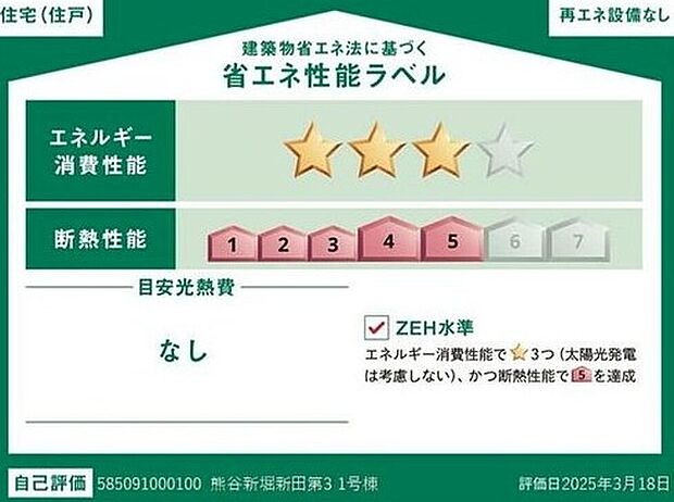 - 星マークの数が多いほどエネルギー消費性能が高いことを示しています。再エネ設備のない住宅は★0~★4の5段階評価、再エネ設備がある住宅は★0~★6の7段階評価となります。