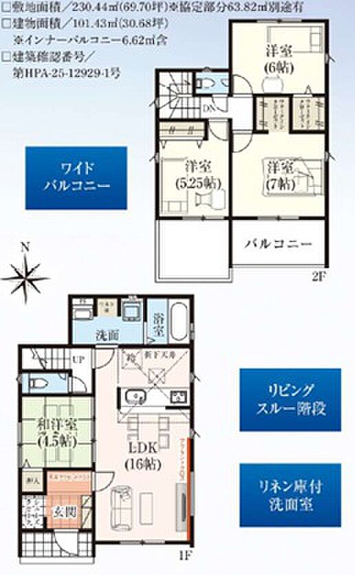 | 間取り | 4LDK 間取り内訳:和室 4.5畳(1階)・リビングダイニングキッチン 16帖(1階)・洋室 7帖(2階)・洋室 6帖(2階)・洋室 5.2帖(2階) |