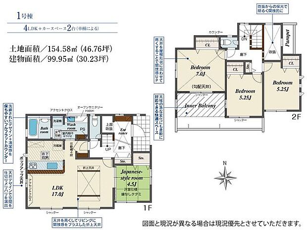 間取り内訳:リビングダイニングキッチン 17帖(1階)・和室 4.5畳(1階)・洋室 7帖(2階)・洋室 5.2帖(2階)・洋室 5.2帖(2階)