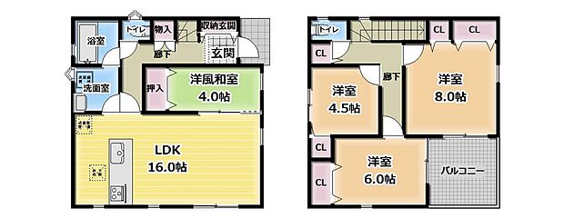 間取り内訳:リビングダイニングキッチン 16帖・和室 4畳(1階)・洋室 8帖(2階)・洋室 6帖(2階)・洋室 4.5帖(2階)