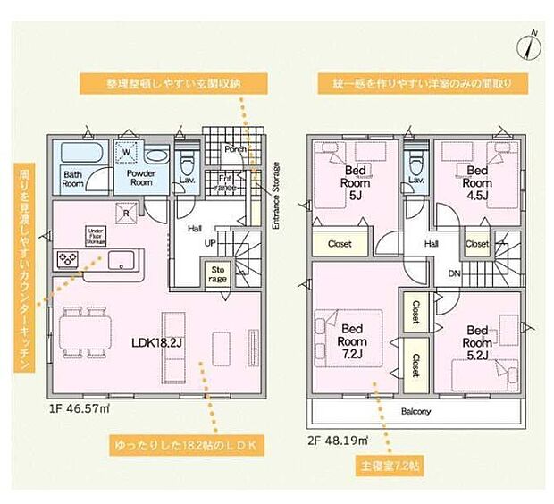| 間取り | 4LDK 間取り内訳:リビングダイニングキッチン 18.2帖・洋室 7.2帖・洋室 5.2帖・洋室 5帖・洋室 4.5帖 |