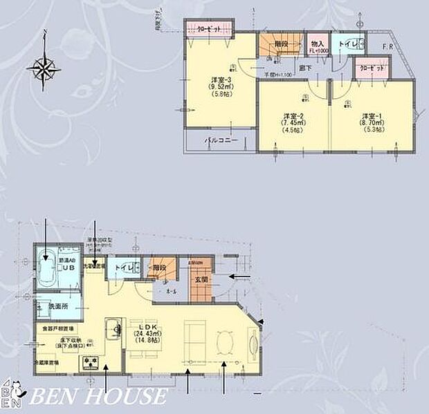 | 間取り | 3LDK 間取り内訳:リビングダイニングキッチン 14.8帖(1階)・洋室 5.8帖(2階)・洋室 5.3帖(2階)・洋室 4.5帖(2階) |