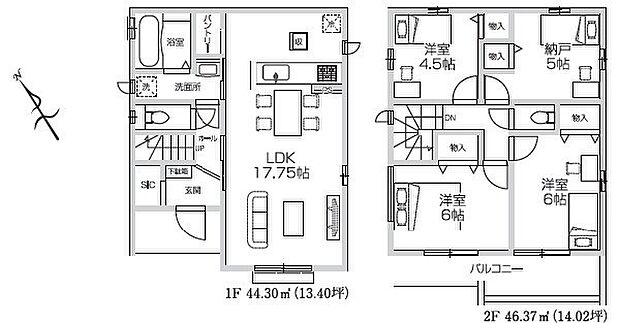 | 間取り | 3SLDK 間取り内訳:リビングダイニングキッチン 17.7帖(1階)・洋室 6帖(2階)・洋室 6帖(2階)・洋室 4.5帖(2階)・収納 5帖(2階) |