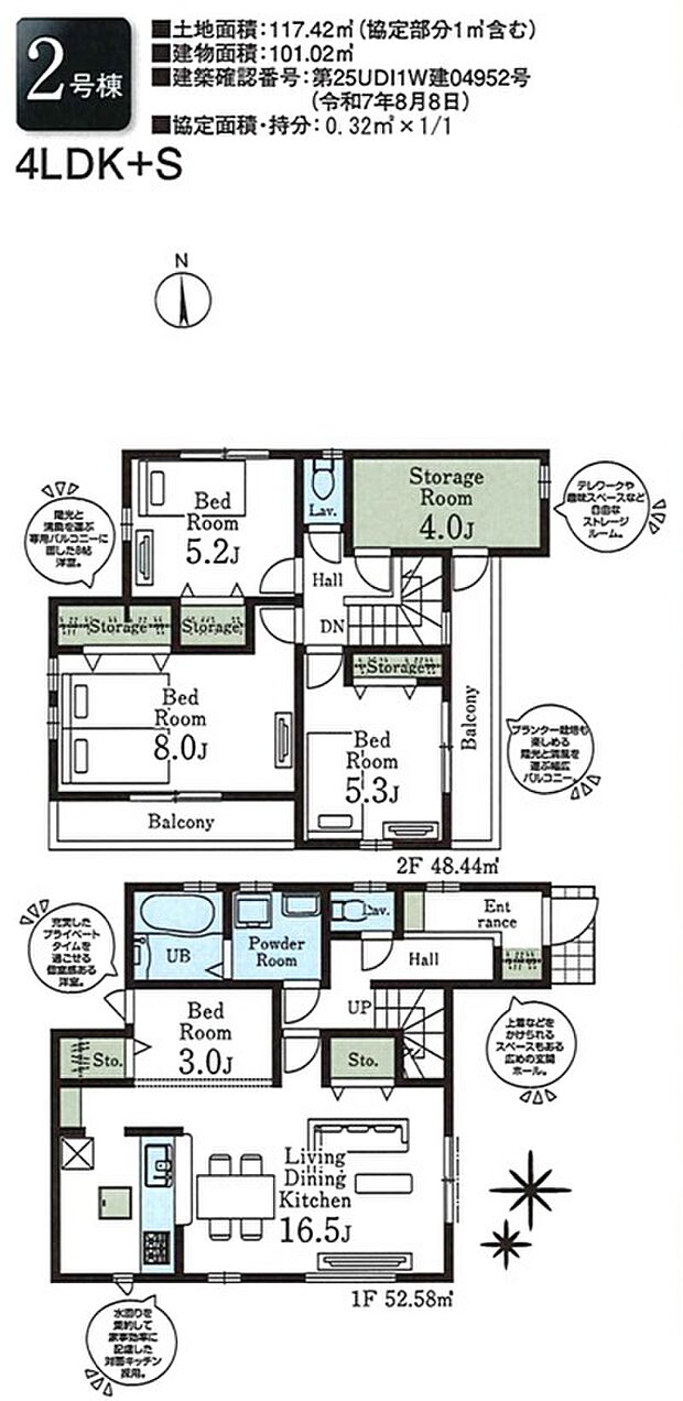| 間取り | 4SLDK 間取り内訳:リビングダイニングキッチン 16.5帖(1階)・洋室 3帖(1階)・洋室 5.2帖(2階)・洋室 5.3帖(2階)・洋室 8帖(2階)・収納 4帖(2階) |