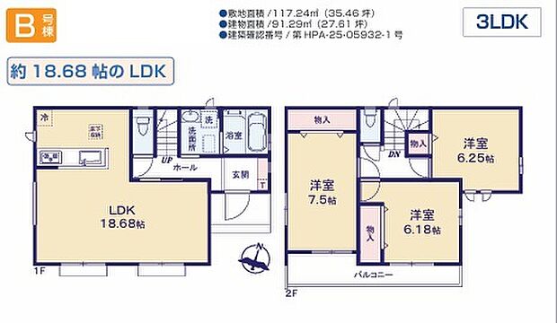 間取り内訳:リビングダイニングキッチン 18.6帖(1階)・洋室 6.1帖(2階)・洋室 6.2帖(2階)・洋室 7.5帖(2階)
