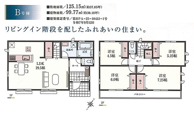 | 間取り | 4LDK 間取り内訳:リビングダイニングキッチン 19.5帖(1階)・洋室 4.5帖(2階)・洋室 5.2帖(2階)・洋室 6帖(2階)・洋室 7.2帖(2階) |