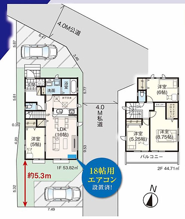 間取り内訳:リビングダイニングキッチン 16帖(1階)・洋室 5帖(1階)・洋室 5.2帖(2階)・洋室 6帖(2階)・洋室 8.7帖(2階)