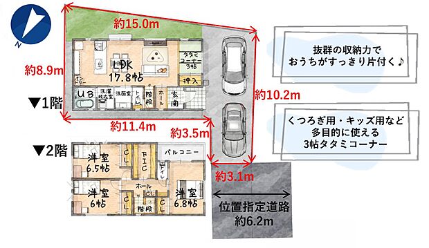 間取り内訳:リビングダイニングキッチン 17.8帖(1階)・洋室 6帖(2階)・洋室 6.5帖(2階)・和室 6.8畳(2階)