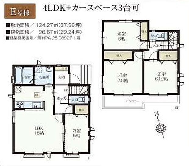 | 間取り | 4LDK 間取り内訳:リビングダイニングキッチン 16帖(1階)・洋室 5帖(2階)・洋室 6帖(2階)・洋室 6.1帖(2階)・洋室 7.5帖(2階) |