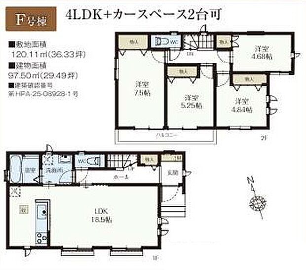 | 間取り | 4LDK 間取り内訳:リビングダイニングキッチン 18.5帖(1階)・洋室 4.6帖(2階)・洋室 4.8帖(2階)・洋室 5.2帖(2階)・洋室 7.5帖(2階) |