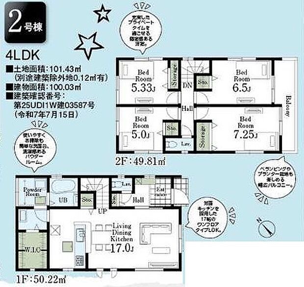 | 間取り | 4LDK 間取り内訳:リビングダイニングキッチン 17帖(1階)・洋室 5帖(2階)・洋室 5.3帖(2階)・洋室 6.5帖(2階)・洋室 7.2帖(2階) |