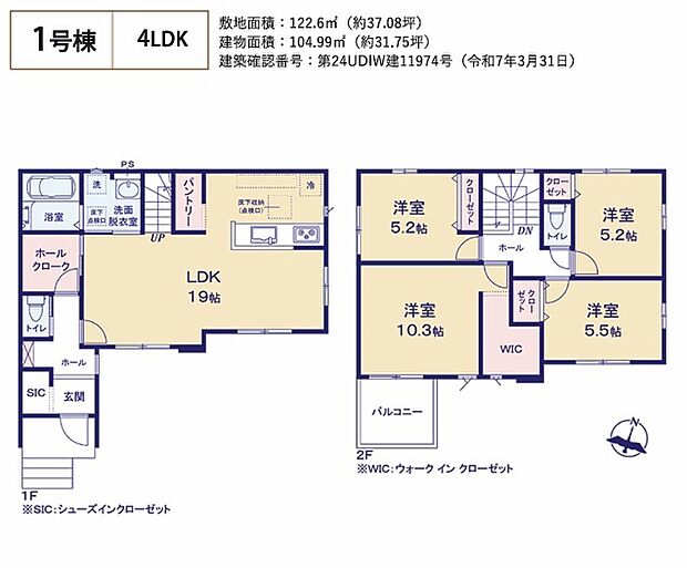 間取り内訳:リビングダイニングキッチン 19帖(1階)・洋室 5.2帖(2階)x2・洋室 5.5帖(2階)・洋室 10.3帖(2階)