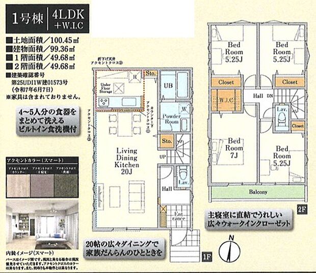 間取り内訳:リビングダイニングキッチン 20帖(1階)・洋室 5.2帖(2階)x3・洋室 7帖(2階)