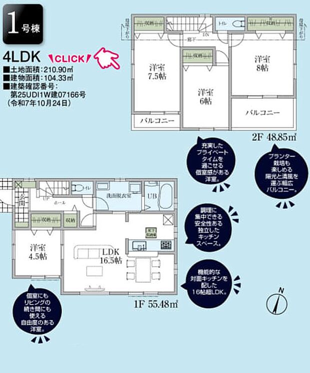 | 間取り | 4LDK 間取り内訳:リビングダイニングキッチン 16.5帖(1階)・洋室 4.5帖(1階)・洋室 7.5帖(2階)・洋室 6帖(2階)・洋室 8帖(2階) |