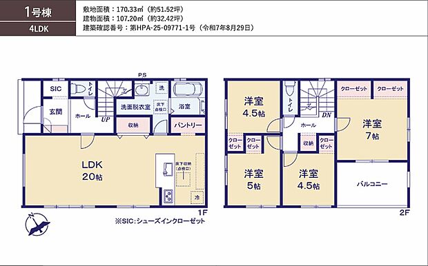 | 間取り | 4LDK 間取り内訳:リビングダイニングキッチン 20帖(1階)・洋室 4.5帖(2階)x2・洋室 5帖(2階)・洋室 7帖(2階) |