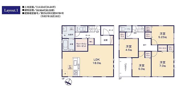 | 間取り | 4LDK 間取り内訳:リビングダイニングキッチン 18帖(1階)・洋室 4.5帖(2階)・洋室 5帖(2階)・洋室 5.2帖(2階)・洋室 7帖(2階) |