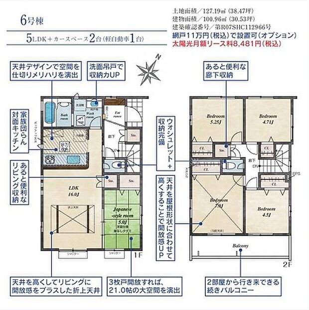 | 間取り | 5LDK 間取り内訳:リビングダイニングキッチン 16帖(1階)・和室 5畳(1階)・洋室 4.5帖(2階)・洋室 4.7帖(2階)・洋室 5.2帖(2階)・洋室 7帖(2階) |