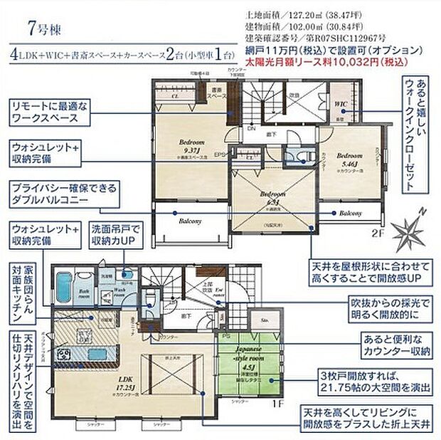 | 間取り | 4LDK 間取り内訳:リビングダイニングキッチン 17.2帖(1階)・和室 4.5畳(1階)・洋室 5.4帖(2階)・洋室 6.3帖(2階)・洋室 9.3帖(2階) |