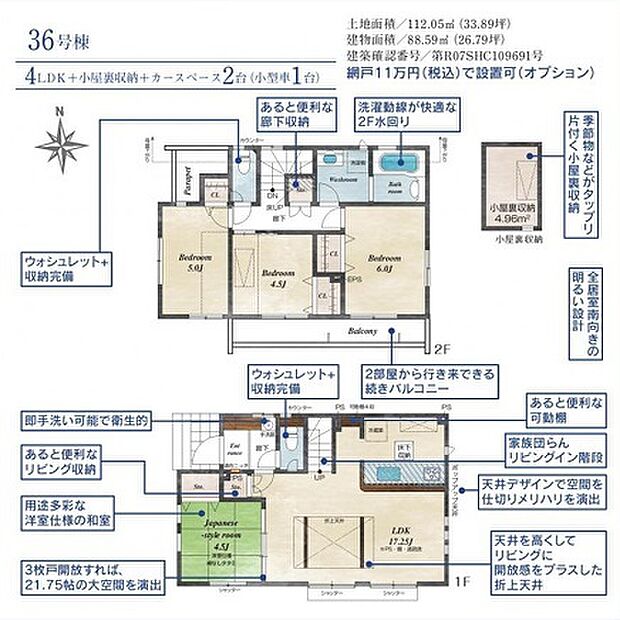 | 間取り | 4LDK 間取り内訳:リビングダイニングキッチン 17.2帖(1階)・和室 4.5畳(1階)・洋室 4.5帖(2階)・洋室 5帖(2階)・洋室 6帖(2階) |